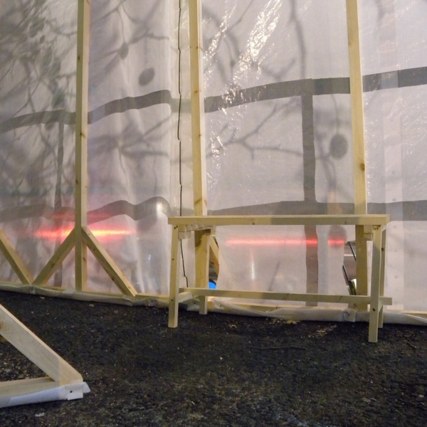 Constructions made out of frames outside the the Royal College of Arts was a final year project Bethany’s done. She used frames, created and used by someone else, and left behind. This is a very good way for students to save money and reuse materials. She put them around a spiral shape outdoors, creating a corridor. To take the project further, she wrapped plastic paper around it and as the final layer, in the very middle she added wool. It looked quite like a construction site from the street, and a very dark space in the inside. She was so engaged and in love with this project, she even spent a night there, with her friends, around a temporary fireplace, singing, making music.